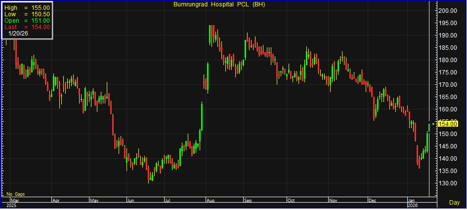 ผู้สื่อข่าวรายงานว่า วันนี้ (20 ม.ค.69) ราคาหุ้น บริษัท โรงพยาบาลบำรุงราษฎร์ จำกัด (มหาชน) หรือ BH ณ เวลา 10:58 น. อยู่ที่ระดับ 154 บาท บวก 4 บาท หรือ 2.67% สูงสุดที่ระดับ 155 บาท ต่ำสุดที่ระดับ 150.50 บาท ด้วยมูลค่าการซื้อขาย 658.94 ล้านบาท