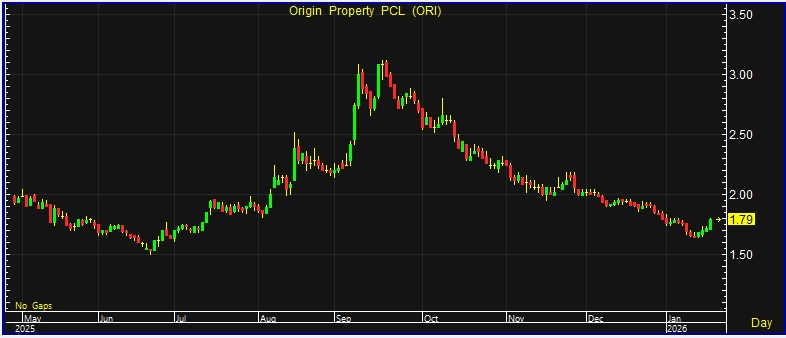 ผู้สื่อข่าวรายงานว่า วันนี้(20 ม.ค.68)บริษัท ออริจิ้น พร็อพเพอร์ตี้ จำกัด (มหาชน) หรือ ORI ณ เวลา 11:44 น. อยู่ที่ระดับ 1.79 บาท บวก 0.07 บาท หรือ 4.07% ราคาสูงสุด 1.80 บาท ราคาต่ำสุด 1.71 บาท ด้วยมูลค่าซื้อขาย 7.86 ล้านบาท