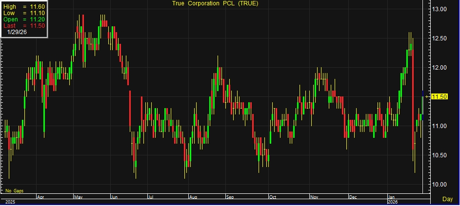 ผู้สื่อข่าวรายงานว่า วันนี้ (29 ม.ค.69) ราคาหุ้น บริษัท ทรู คอร์ปอเรชั่น จำกัด (มหาชน) หรือ TRUE ณ เวลา 10:24 น. อยู่ที่ระดับ 11.40 บาท บวก 0.20 บาท หรือ 1.79% สูงสุดที่ระดับ 11.60 บาท ต่ำสุดที่ระดับ 11.10 บาท ด้วยมูลค่าการซื้อขาย 1.49 พันล้านบาท