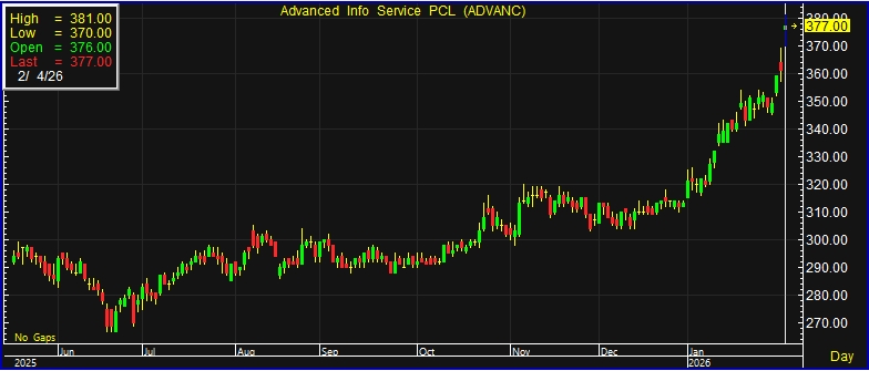 บริษัท แอดวานซ์ อินโฟร์ เซอร์วิส จำกัด (มหาชน) หรือ ADVANC ณ เวลา 10:26 น. อยู่ที่ระดับ 377 บาท บวก 16 บาท หรือ 4.43% ราคาสูงสุด 381 บาท ราคาต่ำสุด 370 บาท ด้วยมูลค่าซื้อขาย 1,536.57 ล้านบาท