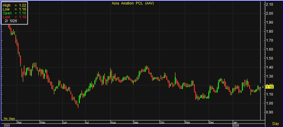 ผู้สื่อข่าวรายงานว่า วันนี้ (5 ก.พ.69) ราคาหุ้น บริษัท เอเชีย เอวิเอชั่น จำกัด (มหาชน) หรือ AAV ณ เวลา 10:35 น. อยู่ที่ระดับ 1.18 บาท บวก 0.03 บาท หรือ 2.61% สูงสุดที่ระดับ 1.22 บาท ต่ำสุดที่ระดับ 1.16 บาท ด้วยมูลค่าการซื้อขาย 191.96 ล้านบาท