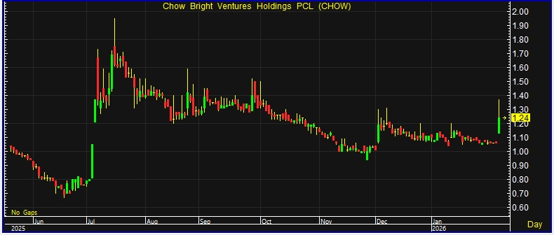 ผู้สื่อข่าวรายงานว่า วันนี้(6ก.พ.69)ราคาหุ้นบริษัท เชาว์ ไบรท์ เวนเจอร์ส โฮลดิ้งส์ จำกัด (มหาชน) หรือ CHOW ณ เวลา 10:22 น. อยู่ที่ระดับ 1.24 บาท บวก 0.18 บาท หรือ 16.98% ราคาสูงสุด 1.37 บาท ราคาต่ำสุด 1.13 บาท ด้วยมูลค่าซื้อขาย 7.61 ล้านบาท
