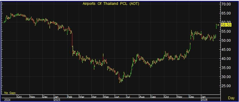 ผู้สื่อข่าวรายงานว่า วันนี้(9 ก.พ.69)ราคาหุ้นบริษัท ท่าอากาศยานไทย จำกัด (มหาชน) หรือ AOT ณ เวลา 10:56 น. อยู่ที่ระดับ 58.50 บาท บวก 5.50 บาท หรือ 10.38% ราคาสูงสุด 59.00 บาท ราคาต่ำสุด 56.50 บาท ด้วยมูลค่าซื้อขาย 4.46 พันล้านบาท