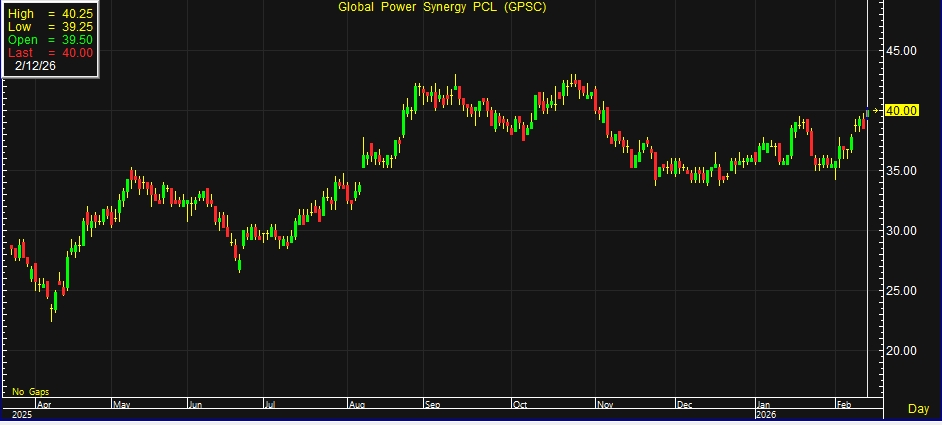 ผู้สื่อข่าวรายงานว่า วันนี้ (12 ก.พ.69) ราคาหุ้น บริษัท โกลบอล เพาเวอร์ ซินเนอร์ยี่ จำกัด (มหาชน) หรือ GPSC ณ เวลา 10:04 น. อยู่ที่ระดับ 40 บาท บวก 1.50 บาท หรือ 3.90% สูงสุดที่ระดับ 40.25 บาท ต่ำสุดที่ระดับ 39.25 บาท ด้วยมูลค่าการซื้อขาย 123.90 ล้านบาท