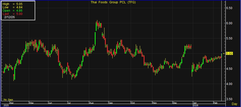 ผู้สื่อข่าวรายงานว่า วันนี้ (12 ก.พ.69) ราคาหุ้น บริษัท ไทยฟู้ดส์ กรุ๊ป จำกัด (มหาชน) หรือ TFG ณ เวลา 11:12 น. อยู่ที่ระดับ 5 บาท บวก 0.16 บาท หรือ 3.31% สูงสุดที่ระดับ 5.05 บาท ต่ำสุดที่ระดับ 4.84 บาท ด้วยมูลค่าการซื้อขาย 137.59 ล้านบาท