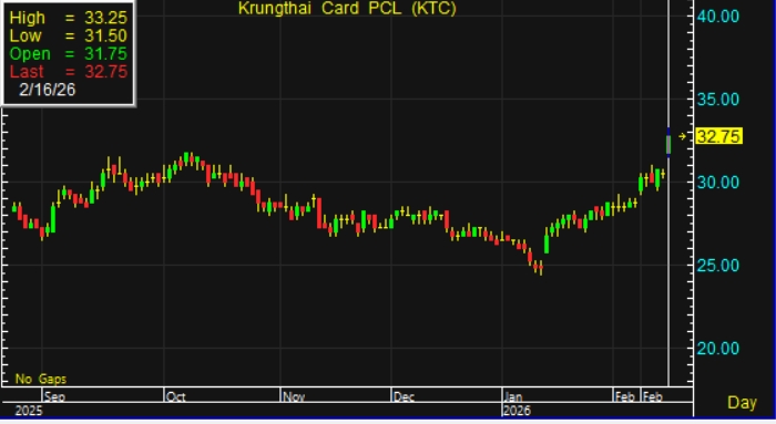 ผู้สื่อข่าวรายงานว่า วันนี้ (16 ก.พ.69) ราคาหุ้น บริษัท บัตรกรุงไทย จำกัด (มหาชน) หรือ KTC ณ เวลา 10:40 น. อยู่ที่ระดับ 32.75 บาท บวก 2.25 บาท หรือ 7.38% สูงสุดที่ระดับ 33.25 บาท ต่ำสุดที่ระดับ 31.50 บาท ด้วยมูลค่าการซื้อขาย 817.92 ล้านบาท