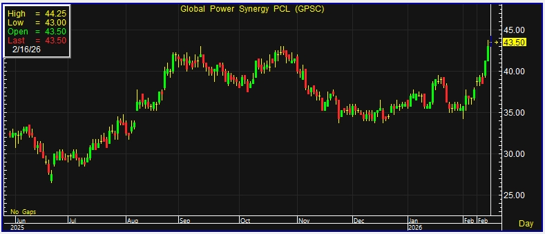 ผู้สื่อข่าวรายงานว่า วันนี้ (16 ก.พ.69) ราคาหุ้น บริษัท โกลบอล เพาเวอร์ ซินเนอร์ยี่ จำกัด (มหาชน) หรือ GPSC ณ เวลา 11:13 น. อยู่ที่ระดับ 43.50 บาท บวก 0.50 บาท หรือ 1.16% ราคาสูงสุด 44.25 บาท ราคาต่ำสุด 43 บาท ด้วยมูลค่าซื้อขาย 186.75 ล้านบาท