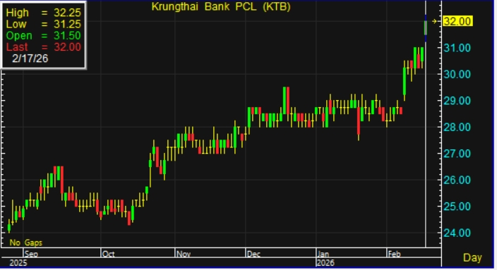 ผู้สื่อข่าวรายงานว่า วันนี้ (17 ก.พ. 69) ราคาหุ้น ธนาคารกรุงไทย จำกัด (มหาชน)หรือ KTB ณ เวลา 10:15 น. อยู่ที่ระดับ 32.00 บาท บวก 1 บาท หรือ 3.23% สูงสุดที่ระดับ 32.25 บาท ต่ำสุดที่ระดับ 31.25 บาท ด้วยมูลค่าการซื้อขาย 603.10 ล้านบาท