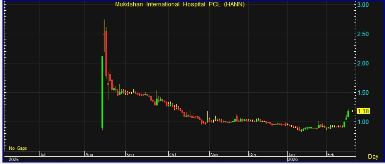 ผู้สื่อข่าวรายงานว่า วันนี้(17ก.พ.69) ราคาหุ้นบริษัท โรงพยาบาลมุกดาหารอินเตอร์เนชั่นแนล จำกัด (มหาชน) หรือ HANN ณ เวลา 11:17 น. อยู่ที่ระดับ 1.18 บาท บวก 0.11 บาท หรือ 10.28% ราคาสูงสุด 1.21 บาท ราคาต่ำสุด 1.08 บาท ด้วยมูลค่าซื้อขาย 65.29 ล้านบาท ราคาหุ้นปรับตัวขึ้นแรงในรอบ 4 เดือน โดยเทียบตั้งแต่หุ้นยืนที่ระดับ 1.20 บาท เมื่อวันที่ 9 ต.ต. 2568