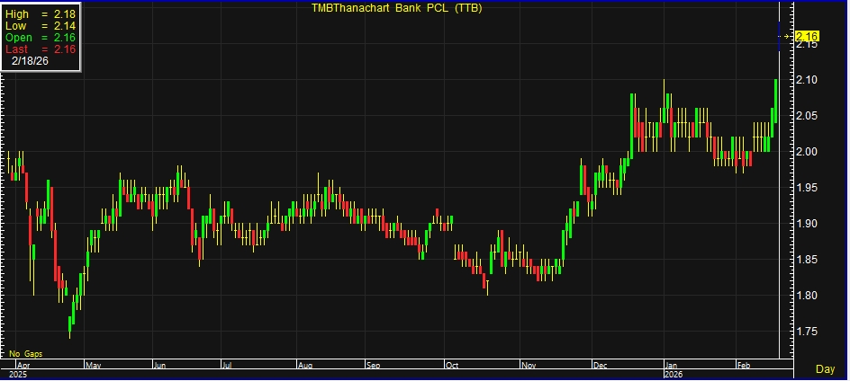 ผู้สื่อข่าวรายงานว่า วันนี้ (18 ก.พ.69) ราคาหุ้น ธนาคารทหารไทยธนชาต จำกัด (มหาชน) หรือ TTB ณ เวลา 10:14 น. อยู่ที่ระดับ 2.16 บาท บวก 0.06 บาท หรือ 2.86% สูงสุดที่ระดับ 2.18 บาท ต่ำสุดที่ระดับ 2.14 บาท ด้วยมูลค่าการซื้อขาย 486.93 ล้านบาท