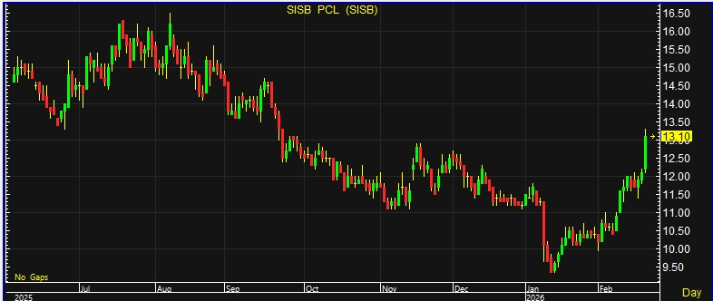 ผู้สื่อข่าวรายงานว่า วันนี้ (19 ก.พ.69) ราคาหุ้นบริษัท เอสไอเอสบี จำกัด (มหาชน) หรือ SISB ณ เวลา 11:33 น. อยู่ที่ระดับ 13.10 บาท บวก 1.00 บาท หรือ 8.26% ราคาสูงสุด 13.30 บาท ราคาต่ำสุด 12.10 บาท ด้วยมูลค่าซื้อขาย 121.38 ล้านบาท ราคาหุ้นปรับตัวแรงในรอบเกือบ 5 เดือน โดยเทียบตั้งแต่หุ้นยืนที่ระดับ 13.30 บาท เมื่อวันที่ 22 ก.ย.2568