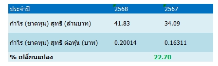 โดยกำไรปี 2568 เพิ่มขึ้นเนื่องจากบริษัทมีรายได้รวม 582.54 ล้านบาท เพิ่มขึ้น 93.09 ล้านบาทคิดเป็น 19.02% เมื่อเทียบกับ ปีก่อน(YoY) และมีกำไรสุทธิ 41.83 ล้านบาท เพิ่มขึ้น 22.70% เทียบช่วงเดียวกันของปีก่อน สะท้อนถึงผลการดำเนินงานที่เติบโตอย่างแข็งแกร่งและมีคุณภาพ