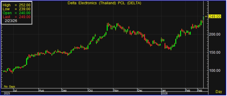 ผู้สื่อข่าวรายงานว่า วันนี้ (23 ก.พ.69) ราคาหุ้น บริษัทเดลต้า อีเลคโทรนิคส์ (ประเทศไทย) จำกัด (มหาชน) หรือ DELTA ณ เวลา 10:21 น. อยู่ที่ระดับ 249.00 บาท บวก 15.00 บาท หรือขึ้นไป6.41% สูงสุดที่ระดับ 252.00 บาท ต่ำสุดที่ระดับ 239.00 บาท ด้วยมูลค่าการซื้อขาย 2,179.64 ล้านบาท