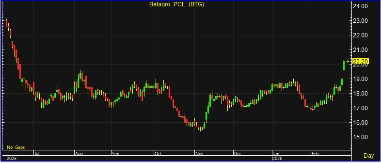 ผู้สื่อข่าวรายงานว่า วันนี้(25 ก.พ.69)ราคาหุ้นบริษัท เบทาโกร จำกัด (มหาชน) หรือ BTG ณ เวลา 10:09 น. อยู่ที่ระดับ 20.20 บาท บวก 1.20 บาท หรือ 6.32% ราคสูงสุด 20.30 บาท ราคาต่ำสุด 19.60 บาท ด้วยมูลค่าซื้อขาย 191.57 ล้านบาท ราคาหุ้นนิวไฮในรอบ 8 เดือน โดยเทียบราคาหุ้นยืนที่ระดับ 20.40 บาท เมื่อวันที่ 18 มิ.ย.68