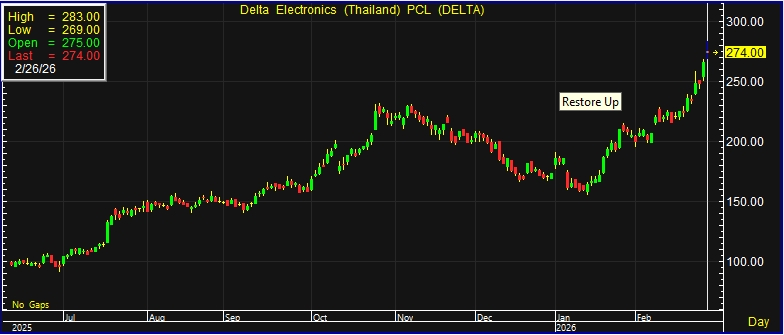 ผู้สื่อข่าวรายงานว่า วันนี้ (26 ก.พ. 69) ราคาหุ้น บริษัทเดลต้า อีเลคโทรนิคส์ (ประเทศไทย) จำกัด (มหาชน) หรือ DELTA ณ เวลา 12.30 น. ปิดตลาดภาคเช้าอยู่ที่ระดับ 274.00 บาท บวก 8.00 บาท หรือ 3.01% สูงสุดที่ระดับ 283.00 บาท ต่ำสุดที่ระดับ 269.00 บาท ด้วยมูลค่าการซื้อขาย 2,655.55 ล้านบาท