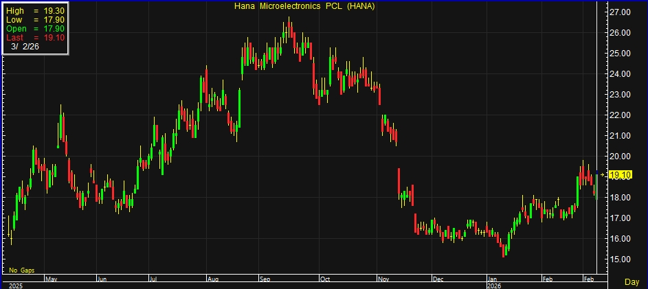 บริษัทหลักทรัพย์ ดีบีเอส วิคเคอร์ส (ประเทศไทย) จำกัด ระบุถึง HANA โดยแนะนำ “ถือเพื่อรับปันผล” ขณะที่ราคาเป้าหมายและคำแนะนำการลงทุนยังอยู่ระหว่างการทบทวน (Under Review) จากราคาปิดก่อนหน้าที่ 18.20 บาท ทั้งนี้ HANA รายงานกำไรสุทธิไตรมาส 4/2568 ที่ 143 ล้านบาท พลิกจากที่ขาดทุน 1.7 พันล้านบาทในไตรมาส 4/2567 ซึ่งในขณะนั้นบริษัทได้รับผลกระทบจากการปรับมูลค่าสินค้าคงคลังและการด้อยค่าสินทรัพย์จำนวนมากในหน่วยธุรกิจ IC ที่ประเทศเกาหลีใต้ หากตัดผลกระทบจากอัตราแลกเปลี่ยน (FX) และรายการพิเศษออก กำไรหลัก (Core Profit) จะเพิ่มขึ้นเป็น 155 ล้านบาท จาก 11 ล้านบาทในไตรมาส 4/2567 โดยได้รับแรงหนุนจากอัตรากำไรขั้นต้นที่ปรับตัวดีขึ้นเล็กน้อยจากฐานที่ต่ำ และมีรายได้อื่นที่เพิ่มขึ้นอย่างมีนัยสำคัญ
