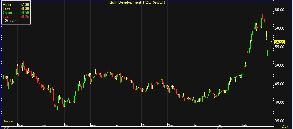 ผู้สื่อข่าวรายงานว่า วันนี้ (3 มี.ค.69) ราคาหุ้น บริษัท กัลฟ์ ดีเวลลอปเมนท์ จำกัด (มหาชน) หรือ GULF ณ เวลา 10:27 น. อยู่ที่ระดับ 56 บาท บวก 2 บาท หรือ 3.70% สูงสุดที่ระดับ 57 บาท ต่ำสุดที่ระดับ 56 บาท ด้วยมูลค่าการซื้อขาย 2.15 พันล้านบาท