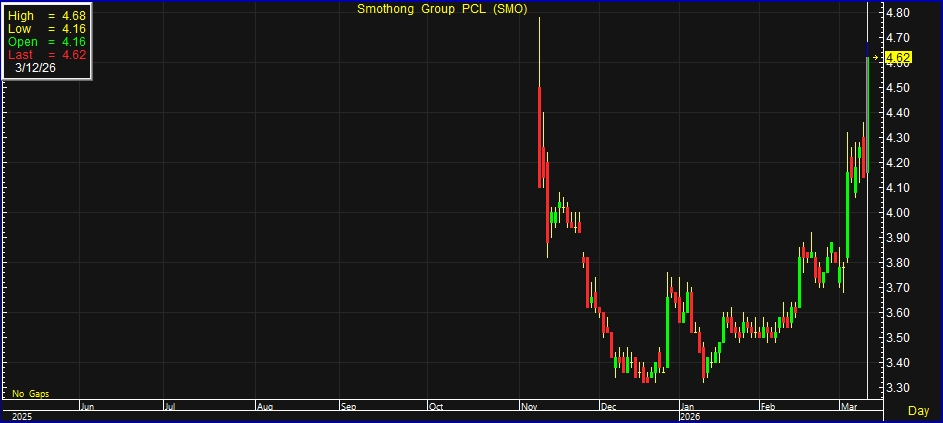 ผู้สื่อข่าวรายงานว่า วันนี้ (12 มี.ค. 69) ราคาหุ้น บริษัท กลุ่มสมอทอง จำกัด (มหาชน) หรือ SMO ปิดตลาดภาคเช้าที่ระดับ 4.62 บาท บวก 0.48 บาท หรือ 11.59% สูงสุดที่ระดับ 4.68 บาท ต่ำสุดที่ระดับ 4.16 บาท ด้วยมูลค่าการซื้อขาย 113.48 ล้านบาท