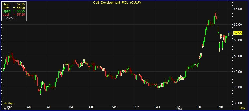 ผู้สื่อข่าวรายงานว่า วันนี้ (17 มี.ค.69) ราคาหุ้น บริษัท กัลฟ์ ดีเวลลอปเมนท์ จำกัด (มหาชน) หรือ GULF ณ เวลา 11:11 น. อยู่ที่ระดับ 57.25 บาท บวก 1.50 บาท หรือ 2.69% สูงสุดที่ระดับ 57.75 บาท ต่ำสุดที่ระดับ 56 บาท ด้วยมูลค่าการซื้อขาย 1.82 พันล้านบาท