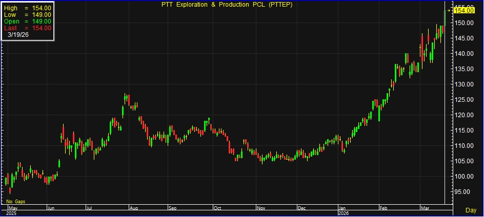ผู้สื่อข่าวรายงานว่า วันนี้ (19 มีนาคม 2569) ราคาหุ้น บริษัท ปตท.สำรวจและผลิตปิโตรเลียม จำกัด (มหาชน) หรือ PTTEP ณ เวลา 10.18 น. อยู่ที่ระดับ 154.00 บาท เพิ่มขึ้น 7.00 บาท หรือ 4.76% โดยทำระดับสูงสุดที่ 154.00 บาท และต่ำสุดที่ 149.00 บาท มูลค่าการซื้อขาย 3.77 พันล้านบาท