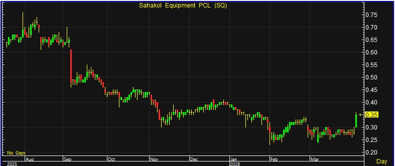 ผู้สื่อข่าวรายงานว่า วันนี้(3เม.ย.69) ราคาหุ้นบริษัท สหกลอิควิปเมนท์ จำกัด (มหาชน) หรือ SQ ณ เวลา 10:14 น. อยู่ที่ระดับ 0.35 บาท บวก 0.07 บาท หรือ 25% ราคาสูงสุด 0.36 บาท ราคาต่ำสุด 0.30 บาท ด้วยมูลค่าซื้อขาย 0.80 ล้านบาท