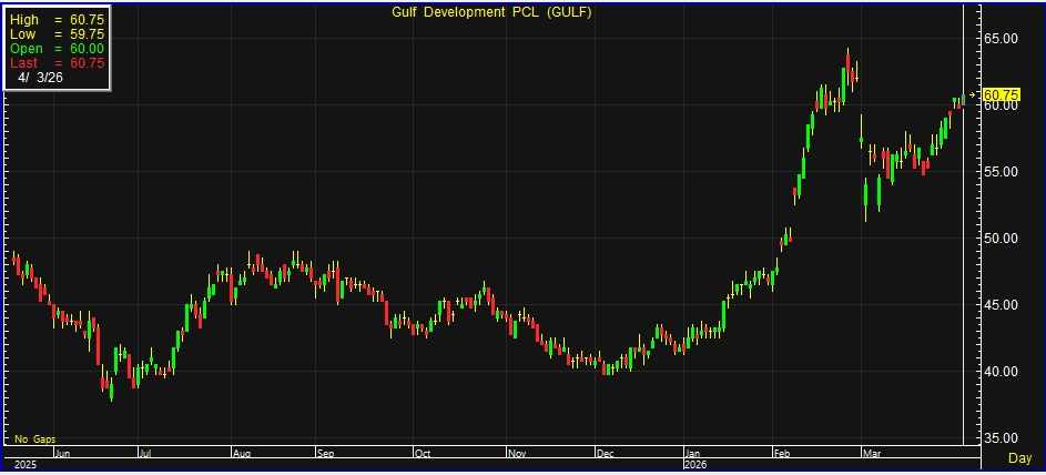 ผู้สื่อข่าวรายงานว่า วันนี้ (3 เม.ย.69) ราคาหุ้น บริษัท กัลฟ์ ดีเวลลอปเมนท์ จำกัด (มหาชน) หรือ GULF ณ เวลา 10:18 น. อยู่ที่ระดับ 60.75 บาท บวก 1 บาท หรือ 1.67% สูงสุดที่ระดับ 60.75 บาท ด้วยมูลค่าการซื้อขาย 577.49 ล้านบาท
