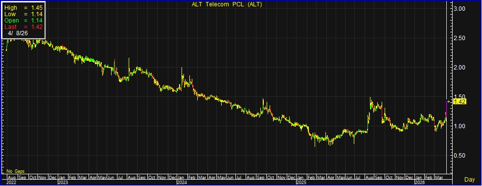 ผู้สื่อข่าวรายงานว่า วันนี้ (8 เม.ย.69) ราคาหุ้น บริษัท เอแอลที เทเลคอม จำกัด (มหาชน) หรือ ALT ปิดตลาด ณ เวลา 16:45 น. อยู่ที่ระดับ 1.42 บาท บวก 0.28 บาท หรือ 24.56% ราคาสูงสุด 1.45 บาท ราคาต่ำสุด 1.14 บาท ด้วยมูลค่าซื้อขาย 34.33 ล้านบาท ราคาหุ้นปรับตัวแรงในรอบ 1 ปี 10 เดือน โดยเทียบตั้งแต่หุ้นยืนที่ระดับ 1.41 บาท เมื่อวันที่ 11 มิ.ย.67