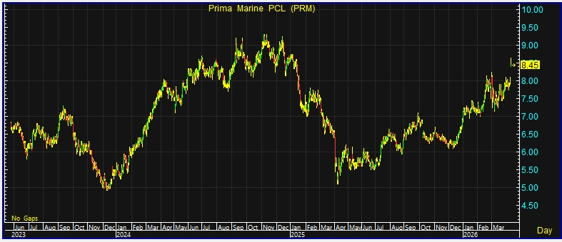 ผู้สื่อข่าวรายงานว่า วันนี้(10 เม.ย.69) ราคาหุ้นบริษัท พริมา มารีน จำกัด (มหาชน) หรือ PRM ณ เวลา 11.04 น. อยู่ที่ระดับ 8.45 บาท บวก 0.50 บาท หรือ 6.29% ราคาสูงสุด 8.65 บาท ราคาต่ำสุด 8.40 บาท ด้วยมูลค่าซื้อขาย 312.25 ล้านบาท