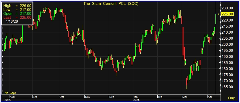 ผู้สื่อข่าวรายงานว่า วันนี้ (16 เม.ย.69) ราคาหุ้น บริษัท ปูนซิเมนต์ไทย จำกัด (มหาชน) หรือ SCC ณ เวลา 10:10 น. อยู่ที่ระดับ 225 บาท บวก 11 บาท หรือ 5.14% สูงสุดที่ระดับ 226 บาท ต่ำสุดที่ระดับ 217 บาท ด้วยมูลค่าการซื้อขาย 1,682.94 ล้านบาท