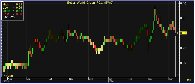 ผู้สื่อข่าวรายงานว่า วันนี้ (16 เม.ย.69) ราคาหุ้น บริษัท เบตเตอร์ เวิลด์ กรีน จำกัด (มหาชน) หรือ BWG ณ เวลา 14:04 น. อยู่ที่ระดับ 0.30 บาท ลบ 0.01 บาท หรือ 3.23% สูงสุดที่ระดับ 0.31 บาท ต่ำสุดที่ระดับ 0.29 บาท ด้วยมูลค่าการซื้อขาย 32.26 ล้านบาท