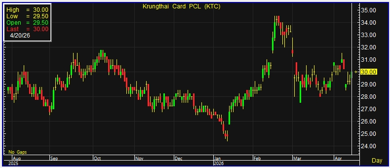 ผู้สื่อข่าวรายงานว่า วันนี้ (20 เม.ย.69) ราคาหุ้น บริษัท บัตรกรุงไทย จำกัด (มหาชน) หรือ KTC ณ เวลา 10:17 น. อยู่ที่ระดับ 30 บาท บวก 0.75 บาท หรือ 2.56% ราคาสูงสุด 30 บาท ราคาต่ำสุด 29.50 บาท ด้วยมูลค่าซื้อขาย 303.90 ล้านบาท