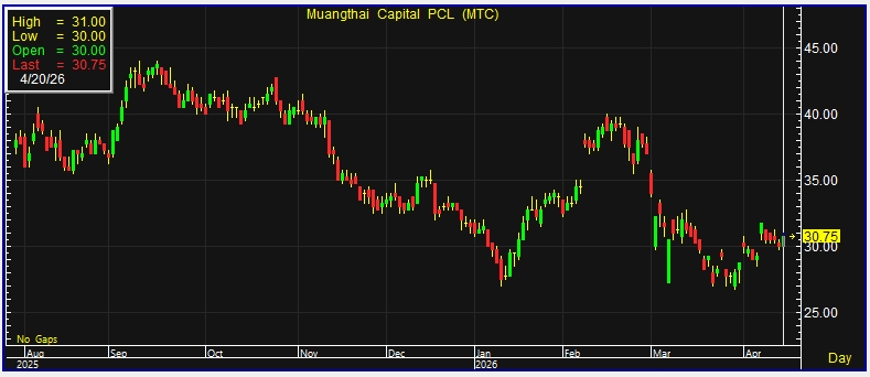 ผู้สื่อข่าวรายงานว่า วันนี้ (20 เม.ย.69) ราคาหุ้น บริษัท เมืองไทย แคปปิตอล จำกัด (มหาชน) หรือ MTC ณ เวลา 11:36 น. อยู่ที่ระดับ 30.75 บาท บวก 0.75 บาท หรือ 2.50% ราคาสูงสุด 31 บาท ราคาต่ำสุด 30 บาท ด้วยมูลค่าซื้อขาย 160.36 ล้านบาท