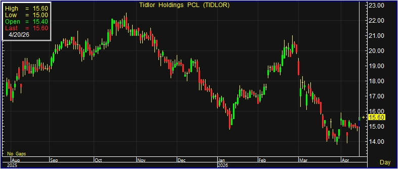 ผู้สื่อข่าวรายงานว่า วันนี้ (20 เม.ย.69) ราคาหุ้น ณ เวลา 11:39 น. บริษัท ติดล้อ โฮลดิ้งส์ จำกัด (มหาชน) หรือ TIDLOR อยู่ที่ระดับ 15.60 บาท บวก 0.70 บาท หรือ 4.70% สูงสุดที่ระดับ 15.60 บาท ต่ำสุดที่ระดับ 15 บาท ด้วยมูลค่าการซื้อขาย 331.13 ล้านบาท