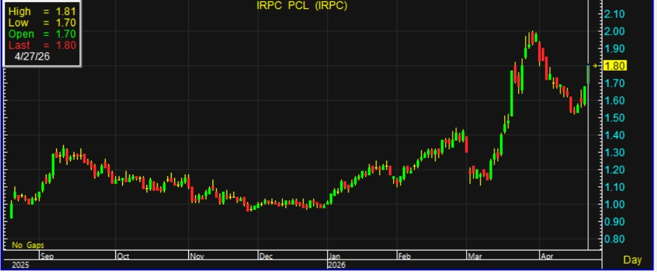 ผู้สื่อข่าวรายงานว่า วันนี้ (27 เม.ย.69) ราคาหุ้น บริษัท ไออาร์พีซี จำกัด (มหาชน) หรือ IRPC ณ เวลา 11:27 น. อยู่ที่ระดับ 1.80 บาท บวก 0.12 บาท หรือ 7.14% สูงสุดที่ระดับ 1.81 บาท ต่ำสุดที่ระดับ 1.70 บาท ด้วยมูลค่าการซื้อขาย 328.94 ล้านบาท