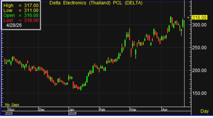 ด้าน บล.ฟินันเซีย ไซรัส แนะ “เก็งกำไร” DELTA ซึ่งอยู่ระหว่างปรับเพิ่มราคาเป้าหมายจาก 300 บาท ประกาศกำไรปกติไตรมาส 1/69 ทำ New High ที่ 9.08 พันล้านบาท เพิ่มขึ้น 25% จากไตรมาสก่อน, เพิ่มขึ้น 65% เมื่อเทียบกับงวดเดียวของปีก่อน หากตัดรายการพิเศษออก กำไรปกติอยู่ที่ 8.84 พันล้านบาท เพิ่มขึ้น 23% จากไตรมาสก่อน และเพิ่มขึ้น 77% เมื่อเทียบกับงวดเดียวของปีก่อน ดีกว่าคาด 6% หนุนจากทั้งรายได้และ Margin ที่ New High จาก Demand สินค้ากลุ่ม Power Electronic แนวโน้มไตรมาส 2/69-ครึ่งปีหลังคาดยังเร่งขึ้นต่อ ได้คำสั่งซื้อ Delta Taiwan มากขึ้น มีแนวโน้มปรับเพิ่มประมาณการกำไรปี 69 ขึ้นจาก 3.54 หมื่นล้านบาท เพิ่มขึ้น 43% เมื่อเทียบกับงวดเดียวของปีก่อน ให้แนวรับ 304-301 บาท หากหลุดแนวรับถัดไป 292 บาท แนวต้าน 319 บาท