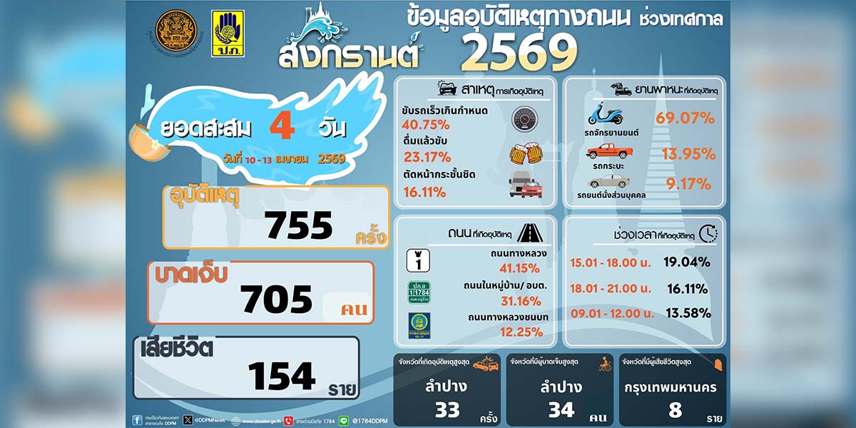 “ศปถ.” เปิดยอดอุบัติเหตุสงกรานต์ 4 วันแรก เจ็บ 705 คน เสียชีวิต 154 ราย