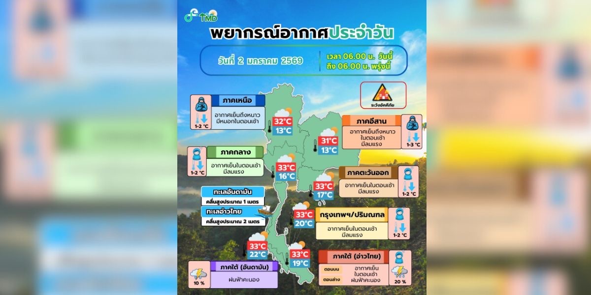 กรมอุตุนิยมวิทยา พยากรณ์อากาศ 24 ชั่วโมงข้างหน้า ร่องมรสุมกำลังปานกลางพาดผ่านภาคเหนือตอนล่าง ภาคกลางตอนบน และภาคตะวันออกเฉียงเหนือ ประกอบกับมรสุมตะวันตกเฉียงใต้กำลังปานกลางพัดปกคลุมทะเลอันดามัน ภาคใต้ และอ่าวไทย
