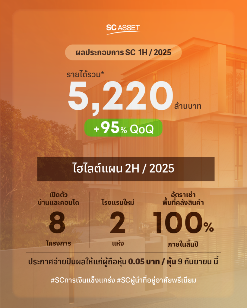 SC Asset กวาดรายได้ไตรมาส 2/68 กว่า 5,220 ล้านบาท โต 95% พร้อมมีแบ็กล็อกแกร่ง 19,600 ล้านบาท ครึ่งปีหลังเดินหน้าเปิดโครงการใหม่ 8 โครงการ 16,400 ล้านบาท เคาะจ่ายปันผลระหว่างกาล 0.05 บาทต่อหุ้น ดีเดย์ 9 ก.ย.นี้