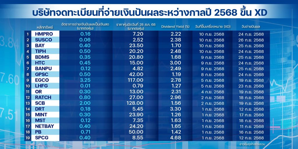 แนะสอย 19 หุ้นปันผลระหว่างกาลปี 68 ก่อนขึ้นเครื่องหมาย XD สัปดาห์หน้า (1-5 ก.ย.) ส่วน Dividend Yield คิดจากราคาปิดวันที่ 28 ส.ค. 68 ประมาณ 2-4.68%