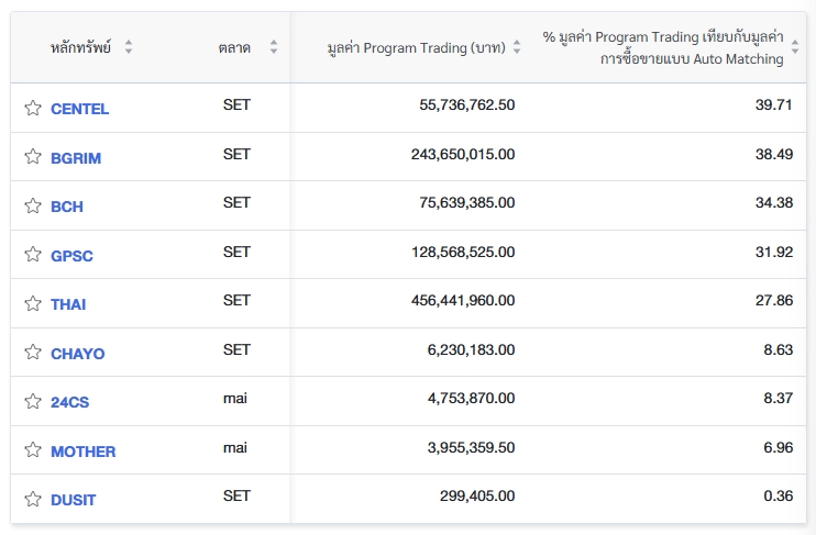 นอกจากนี้ ตลท.ยังรายงานข้อมูลหลักทรัพย์ที่ใช้ Program Trading ซื้อขายสูงสุด 9 อันดับ โดยเรียงจากเปอร์เซ็นต์ (%) มูลค่า Program Trading เทียบกับมูลค่าการซื้อขายแบบ Auto Matching ดังนี้