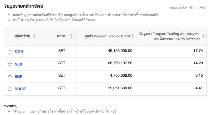 นอกจากนี้ ตลท. ยังรายงานข้อมูลหลักทรัพย์ที่ใช้ Program Trading ซื้อขายสูงสุด 4 อันดับ โดยเรียงจากเปอร์เซ็นต์ (%) มูลค่า Program Trading เทียบกับมูลค่าการซื้อขายแบบ Auto Matching ดังนี้ STPI, NEX, SHR และ DUSIT
