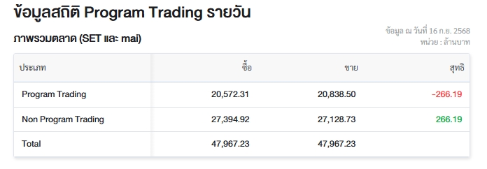 ผู้สื่อข่าวรายงานว่า วันนี้ (16 ก.ย.68) ตลาดหลักทรัพย์แห่งประเทศไทย (ตลท.) เปิดเผยข้อมูลซื้อขายรายวันผ่าน Program Trading หรือ “โปรแกรมโรบอทเทรดดิ้ง” มีมูลค่าซื้อจำนวน 20,572.31 ล้านบาท และมูลค่าขายจำนวน 20,838.50 ล้านบาท เท่ากับขายสุทธิ 266.19 ล้านบาท