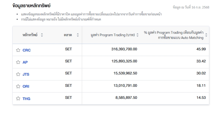 นอกจากนี้ ตลท. ยังรายงานข้อมูลหลักทรัพย์ที่ใช้ Program Trading ซื้อขายสูงสุด 5 อันดับ โดยเรียงจากเปอร์เซ็นต์ (%) มูลค่า Program Trading เทียบกับมูลค่าการซื้อขายแบบ Auto Matching ดังนี้