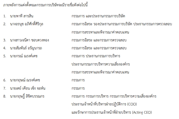 ทั้งนี้ คณะกรรมการบริษัทได้อนุมัติแต่งตั้ง นายกฤษฎิ์ ลิขิตบรรณกร ซึ่งดำรงตำแหน่งกรรมการบริหาร และประธานเจ้าหน้าที่บริหารฝ่ายปฏิบัติการ (Chief Operating Officer: COO) ให้เข้าดำรงตำแหน่งกรรมการ กรรมการบริหารความเสี่ยงองค์กร และรักษาการประธานเจ้าหน้าที่ฝ่ายบริหาร (Acting CEO) แทน นางสาวปลื้มจิตต์ ไชยา โดยมีผลตั้งแต่วันที่ 1 ตุลาคม 2568 เช่นเดียวกัน