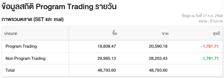 ผู้สื่อข่าวรายงานว่า วันนี้ (17 ก.ย.68) ตลาดหลักทรัพย์แห่งประเทศไทย (ตลท.) เปิดเผยข้อมูลซื้อขายรายวันผ่าน Program Trading หรือ “โปรแกรมโรบอทเทรดดิ้ง” มีมูลค่าซื้อจำนวน 18,808.47 ล้านบาท และมูลค่าขายจำนวน 20,590.18 ล้านบาท เท่ากับขายสุทธิ 1,781.71 ล้านบาท