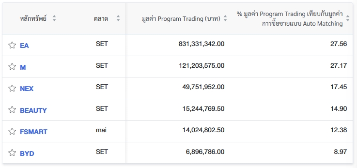 นอกจากนี้ ตลท. ยังรายงานข้อมูลหลักทรัพย์ที่ใช้ Program Trading ซื้อขายสูงสุด 6 อันดับ โดยเรียงจากเปอร์เซ็นต์ (%) มูลค่า Program Trading เทียบกับมูลค่าการซื้อขายแบบ Auto Matching ดังนี้