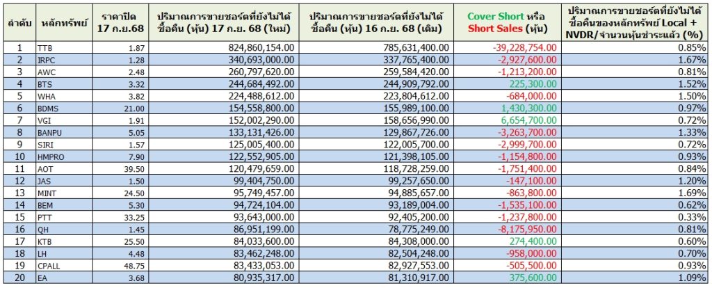 เปิด 20 อันดับหุ้นถูก “Cover-Short” สูงสุด ณ 17 ก.ย.68