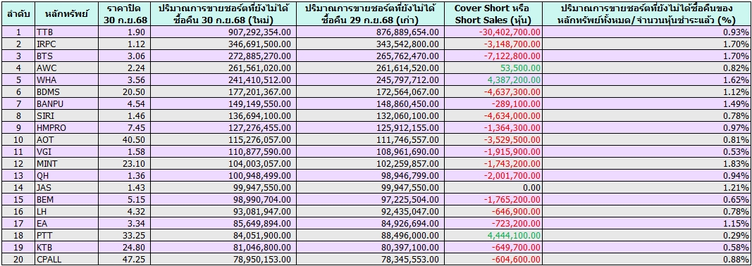 เปิด 20 อันดับหุ้นถูก “Cover-Short” สูงสุด ณ 30 ก.ย.68
