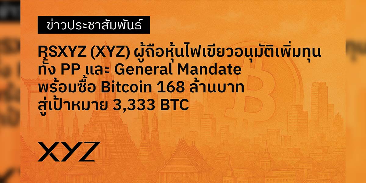ผู้ถือหุ้น RSXYZ ไฟเขียว อนุมัติการเพิ่มทุนทั้ง PP และ General Mandate พร้อมซื้อ Bitcoin มูลค่า 168 ล้านบาท สู่เป้าหมาย 3,333 BTC ภายใน 3 ปี