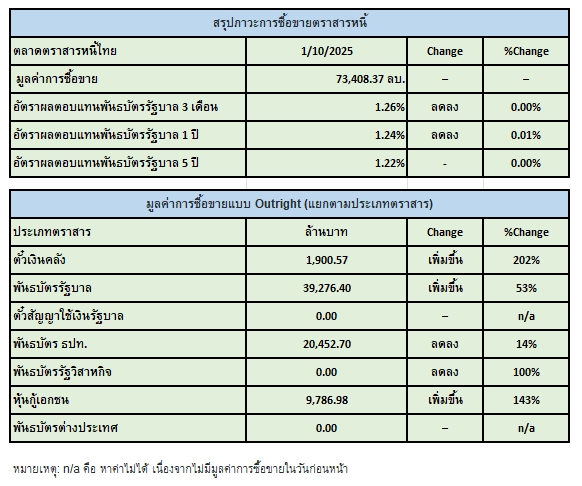 สมาคมตลาดตราสารหนี้ไทย(ThaiBMA) สรุปภาวะตลาดตราสารหนี้ไทยประจำวันนี้(1ต.ค.68) มีมูลค่าการซื้อขายรวมทั้งวันอยู่ที่ 73,408 ล้านบาท ด้านประเภทของนักลงทุน ที่มีมูลค่าการซื้อขายสูงที่สุด 2 อันดับแรก คือ 1. กลุ่มบริษัทหลักทรัพย์จัดการกองทุน (บลจ.) ขายสุทธิ 3,078 ล้านบาท 2. กลุ่มบริษัทประกัน ขายสุทธิ 416 ล้านบาท ในขณะที่นักลงทุนต่างชาติ ขายสุทธิ 322 ล้านบาท Yield พันธบัตรอายุ 5 ปี ปิดที่ 1.22% ไม่มีการเปลี่ยนแปลงจากเมื่อวาน